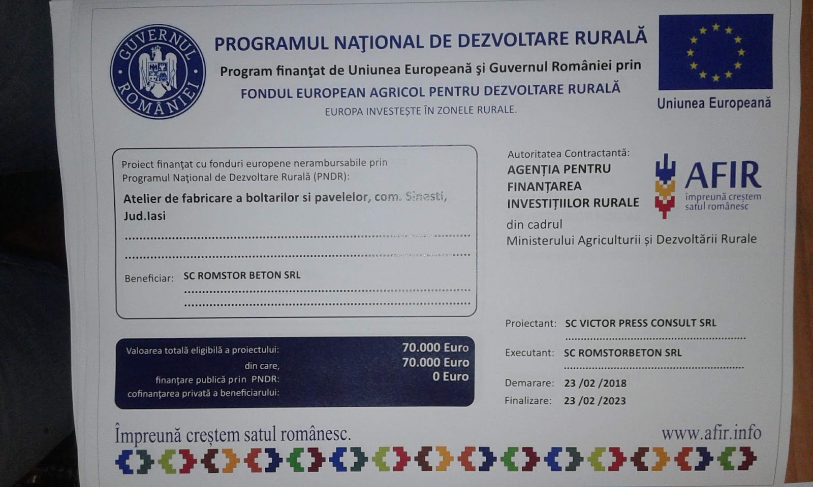Proiect finantat cu fonduri europene nerambursabile prin: Programul National de Dezvoltare Rurala PNDR.